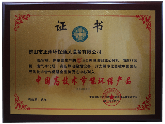 2017年7月,佛山正州玻璃鋼風(fēng)機廠就好像外面的太陽,熱火朝天。好事一波接一波,先是通過了2016年度重合同守信用單,現(xiàn)在又通過了高技術(shù)產(chǎn)品認證,并獲得高技術(shù)產(chǎn)品證書。此次佛山正州環(huán)保生產(chǎn)的玻璃鋼離心風(fēng)機、防腐pp風(fēng)機、廢氣凈化塔、高壓靜電除煙設(shè)備、UV光解凈化器被中國國際經(jīng)濟技術(shù)合作品牌視為核心列入了中國高技術(shù)節(jié)能環(huán)保產(chǎn)品!建立起頂端品牌一直是佛山正州環(huán)保努力的目標(biāo)!隨著企業(yè)的不斷發(fā)展,佛山正州環(huán)保不斷擴大生產(chǎn)規(guī)模,完善玻璃鋼離心風(fēng)機、廢氣凈化塔、UV光解凈化器等產(chǎn)品的功能和品質(zhì),并受到了中國品牌視為核心的承認。這標(biāo)志著佛山正州環(huán)保這個品牌是廢氣處理設(shè)備高技術(shù)節(jié)能環(huán)保產(chǎn)品的一大品牌。